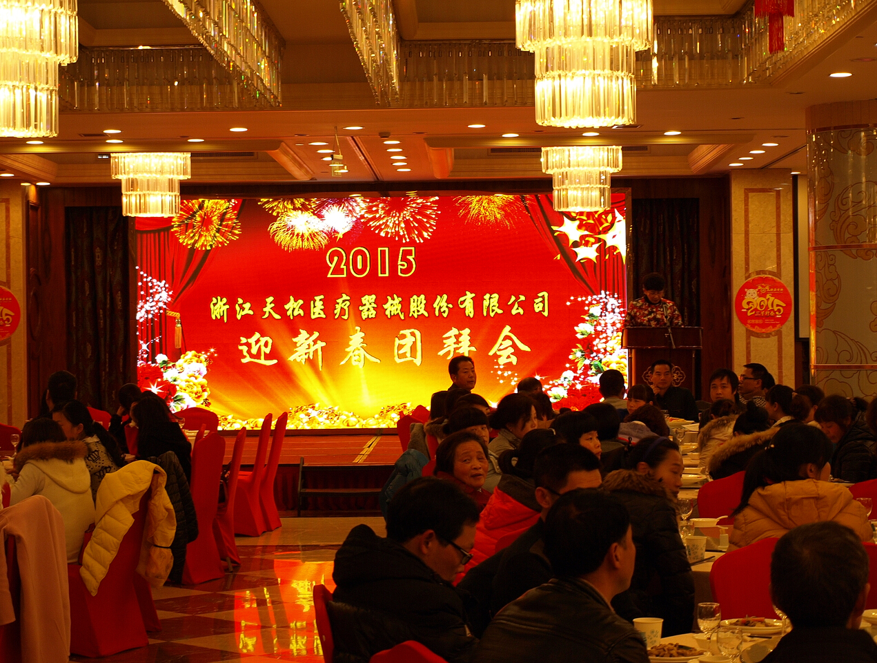 歡聲笑語,喜逢新歲;一年復始,萬象更新。2015年2月14日,浙江天松醫療器械股份有限公司2015年新春團拜會在久緣宴會廳隆重召開。會議開始,公司總經理對2014年的工作情況作了全面、客觀的總結,充分肯定了過去一年來所取得的成績,展望了公司未來美好的發展趨勢。會議對2014年中表現優秀的員進行了表彰和獎勵,同時希望各位員工在今后工作中都能夠繼續堅守自己的崗位,不驕不躁,在工作中真正地起到模范帶頭作用。公司董事長高度概括和肯定了2014年公司所取得的成績及來年的發展思路,并向全體員工及其家屬朋友們致以新春的祝福和誠摯的問候!會后公司舉辦了年終晚會和聚餐,在充滿著激情、熱烈、活躍的氣氛中圓滿結束了2015年新春團拜會。